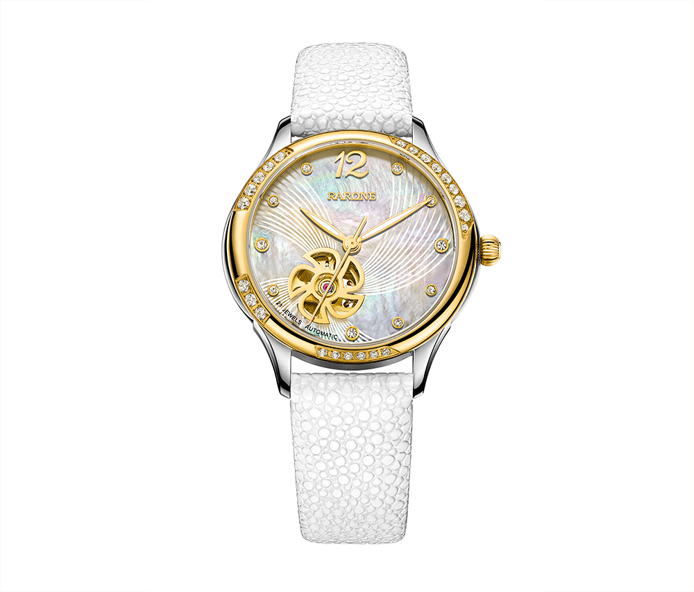 雷諾表在活動中發(fā)布女表新成員——夜色·芳菲機械表。夜色系列是雷諾表最受矚目的女表系列之一,該款腕表的設(shè)計理念,靈感源于對時代女性力量和美麗贊美。以溫和的曲線,流暢的線條傳達對機械與美學(xué)的理解。機械機芯、水晶鉆石代表力量,珍珠貝母表盤、花朵元素代表美麗。鏤空小眼展現(xiàn)花朵的雀躍靈動,并在珍珠貝母面上拖曳出動感的線條,再現(xiàn)女性的活力與優(yōu)雅。魔鬼魚皮表帶為時尚趨勢,整體風(fēng)格非常適合女性出席多種場合佩戴。